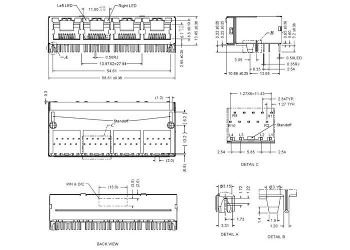 DieRTC-1QDBAM1Aist ein hochdichtes, 4-portes (1x4) RJ45-Modulanschluss mit integrierter 10/100/1000Base-T-Magnetik.integrierte Zustands-LEDsEs ist ideal für Switches, Router und industrielle Computergeräte, die mehrere Hochgeschwindigkeits-Ethernet-Ports benötigen.
